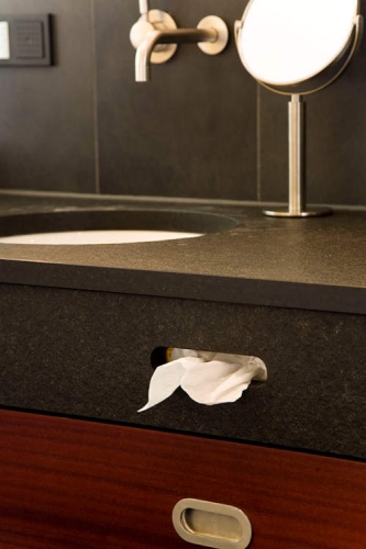 Modernes Bad mit begehbarer Dusche und aus Stein angefertigter Tissuebox.