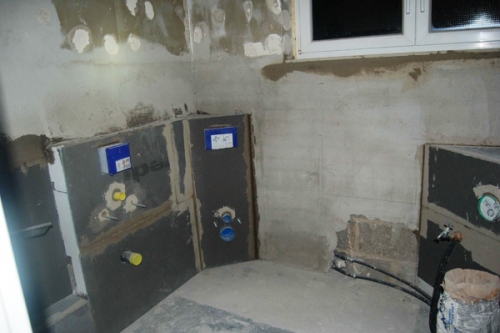 Im Obergeschoß eines Reihenhauses in Wiesbaden entsteht ein Bad zum Wohlfühlen. Während der Bauphase.